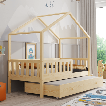 z pojedynczą szufladą: dzięki wykorzystaniu przestrzeni pod łóżkiem na pojedynczą szufladę na kółeczkach z dnem wykładaną białą płytą HDF otrzymujemy przestrzeń do przechowywania np. zabawek czy pościeli.
