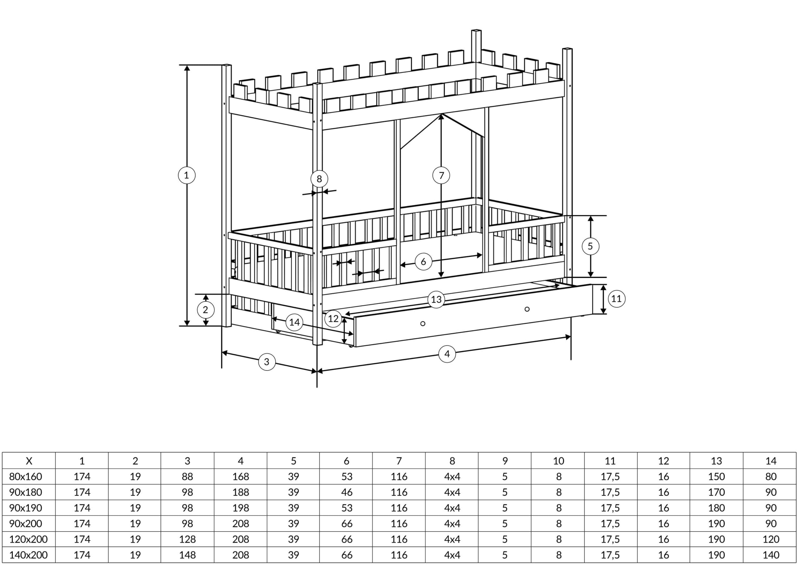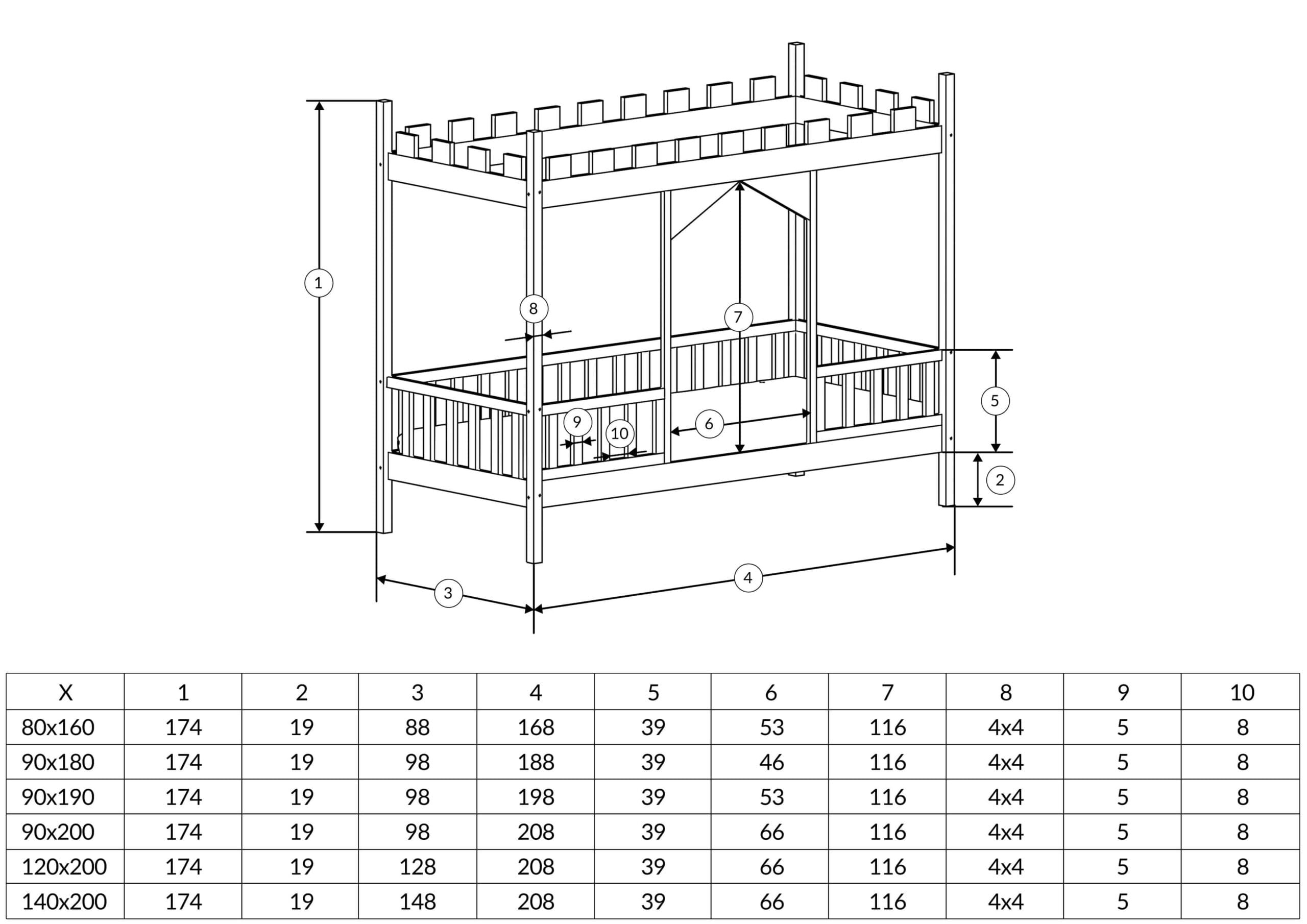 Łóżeczko DRAGON w kształcie zamku zostało ręcznie wykonane z litego drewna sosnowego w klasie I. Łóżeczko występuje w trzech wariantach kolorystycznych jak: sosna, biały i szary. Każda wersja kolorystyczna łóżeczka może mieć kilka dodatkowych opcji w postaci: podwyższenia (wówczas łóżeczko ma wydłużone nogi celem łatwiejszego dostępu pod nie), szuflady pojedynczej lub podwójnej oraz dodatkowej szuflady z funkcja spania. Każde łóżeczko malowane jest farbami bezpiecznymi dla dzieci czyli zgodnymi z normami PN-EN 71-3. Jeśli dziecko już wyrośnie z zabawy a nadal chcielibyśmy użytkować łóżeczko to jest możliwość demontażu wejścia wraz z przednimi barierkami co znacznie wydłuża okres użytkowania łóżeczka. Zachęcamy również do zapoznania się z ofertami lamp marki LIGHTWOOD.