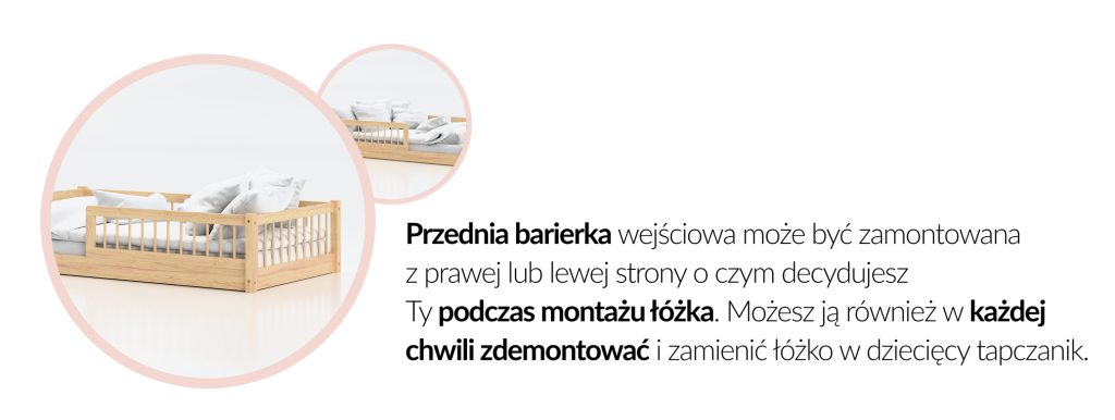 Model dostępny jest jako łóżko podłogowe – czyli łóżko niskie dla dziecka, które ułatwia samodzielne korzystanie już najmłodszym użytkownikom. Dla większej funkcjonalności oferujemy także wersję podwyższoną, zapewniającą dodatkowe miejsce pod konstrukcją.