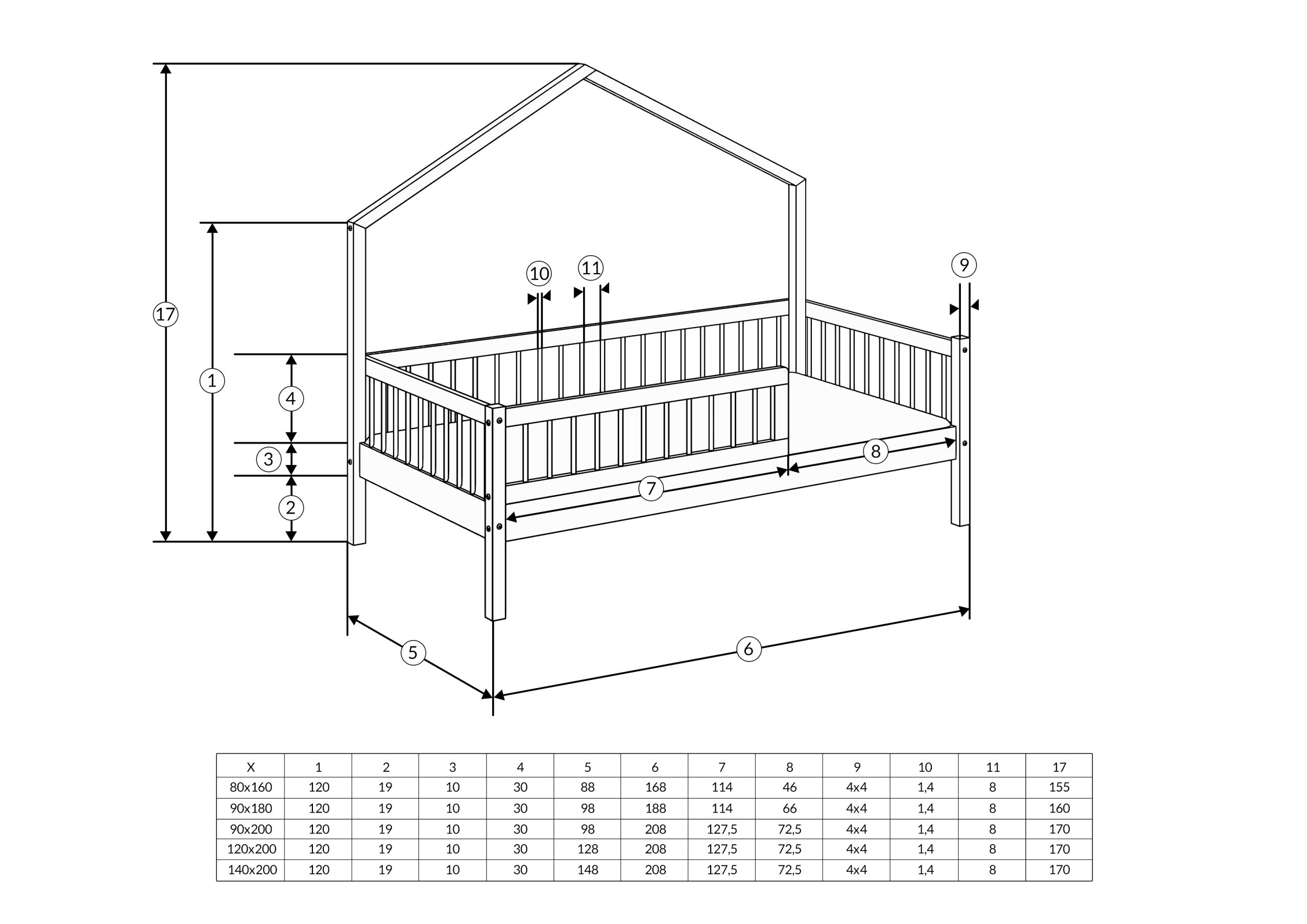 Wszystkie rozmiary łóżek odpowiadają rozmiarom dostępnych materacy. Przykładowo do łóżka o wymiarach 90×200 należy również wybrać materac o wymiarze 90×200 cm. Grubość materaca nie ma znaczenia i może być dowolna.