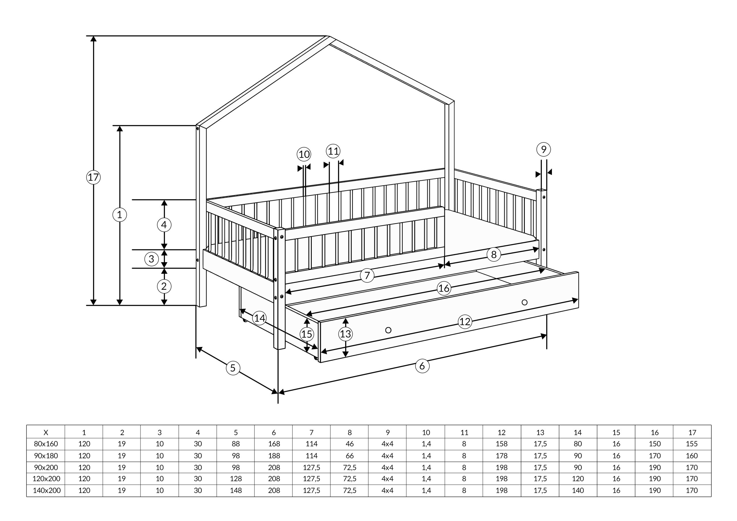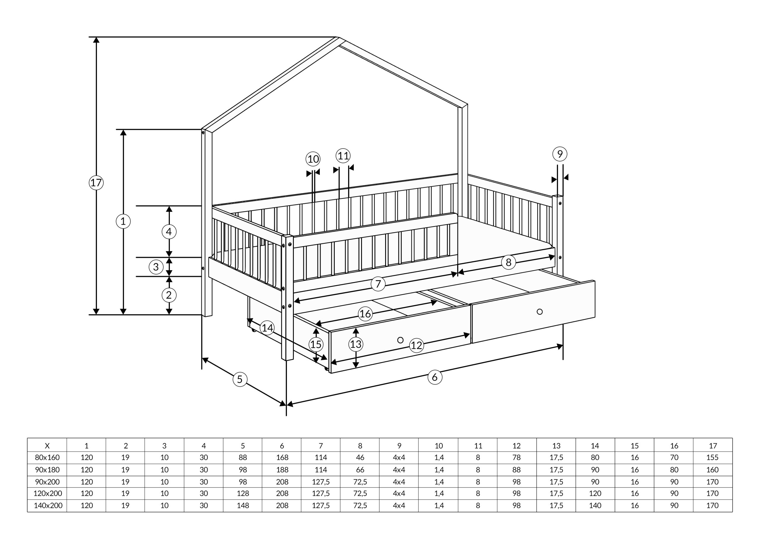 z pojedynczą szufladą: dzięki wykorzystaniu przestrzeni pod łóżkiem na pojedynczą szufladę na kółeczkach z dnem wykładaną białą płytą HDF otrzymujemy przestrzeń do przechowywania np. zabawek czy pościeli.