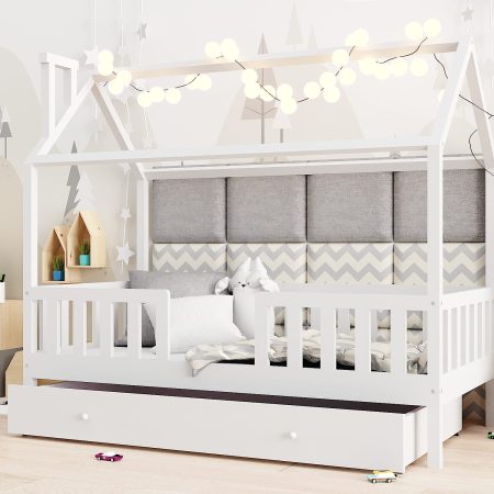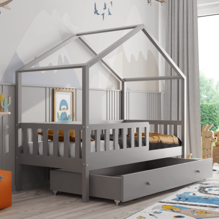 z pojedynczą szufladą: dzięki wykorzystaniu przestrzeni pod łóżkiem na pojedynczą szufladę na kółeczkach z dnem wykładaną białą płytą HDF otrzymujemy przestrzeń do przechowywania np. zabawek czy pościeli.