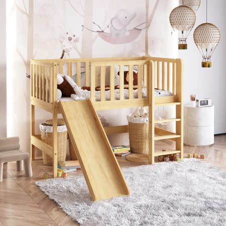 z funkcją spania: dzięki zastosowaniu wysuwanej szuflady na kółeczkach wraz z drabinką pod materac uzyskaliśmy dodatkową powierzchnię do spania dla drugiego dziecka lub mniej lub bardziej spodziewanych gości.