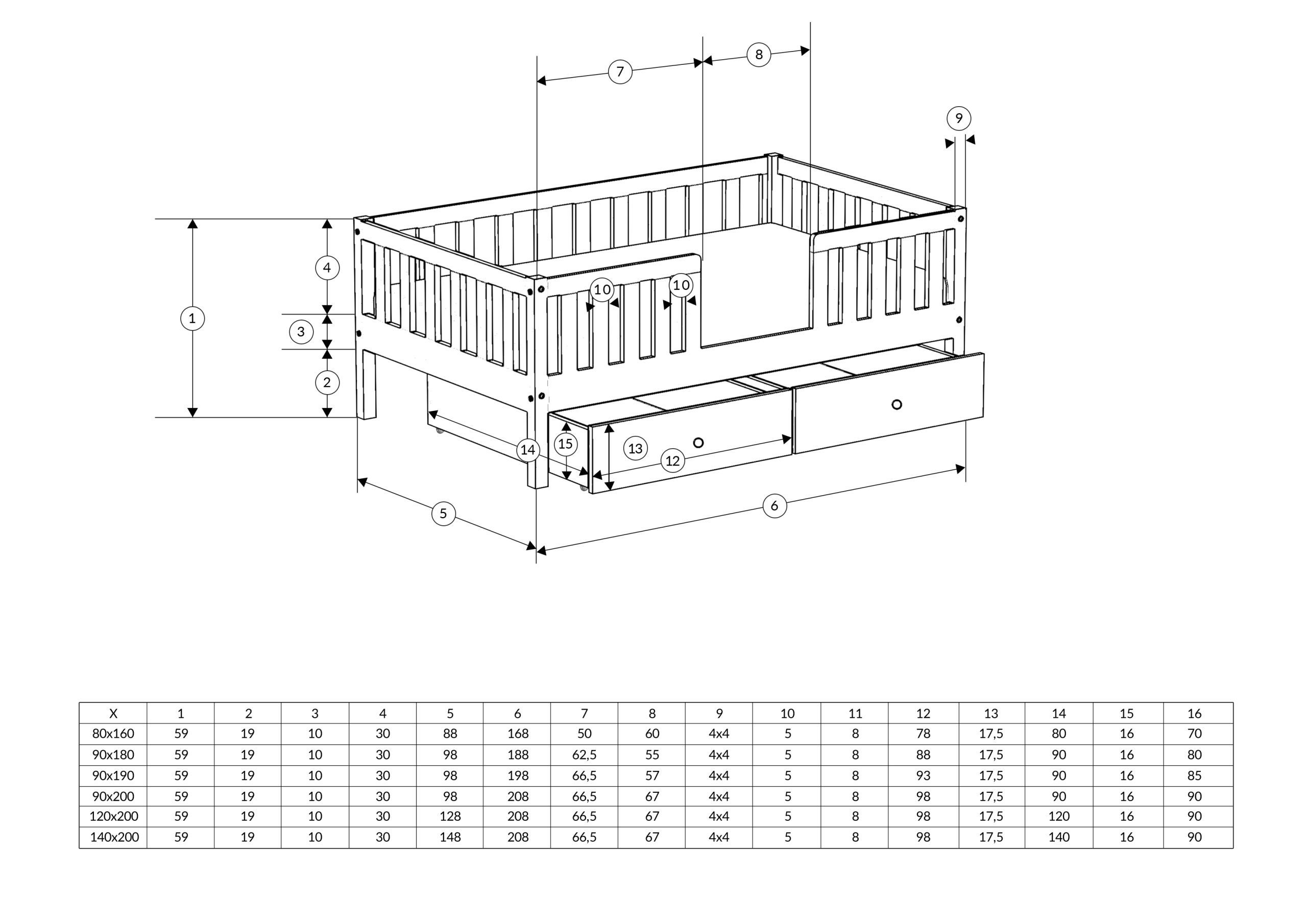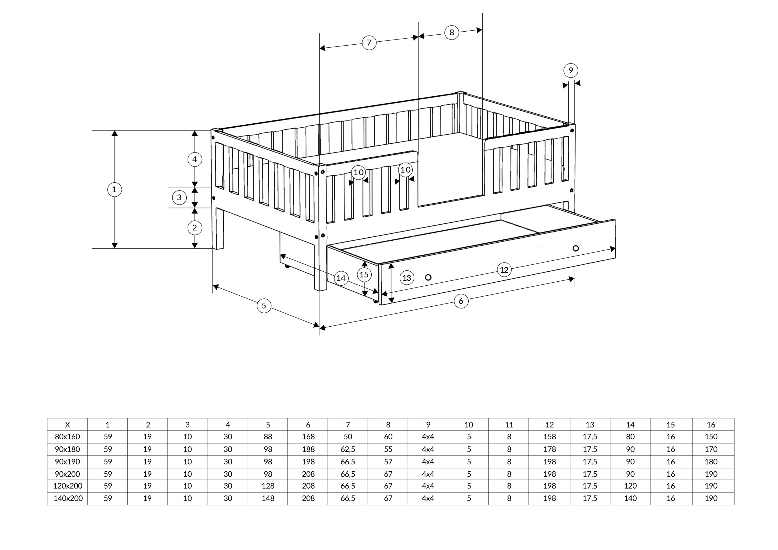 Wszystkie rozmiary łóżek odpowiadają rozmiarom dostępnych materacy. Przykładowo do łóżka o wymiarach 90×200 należy również wybrać materac o wymiarze 90×200 cm. Grubość materaca nie ma znaczenia i może być dowolna.