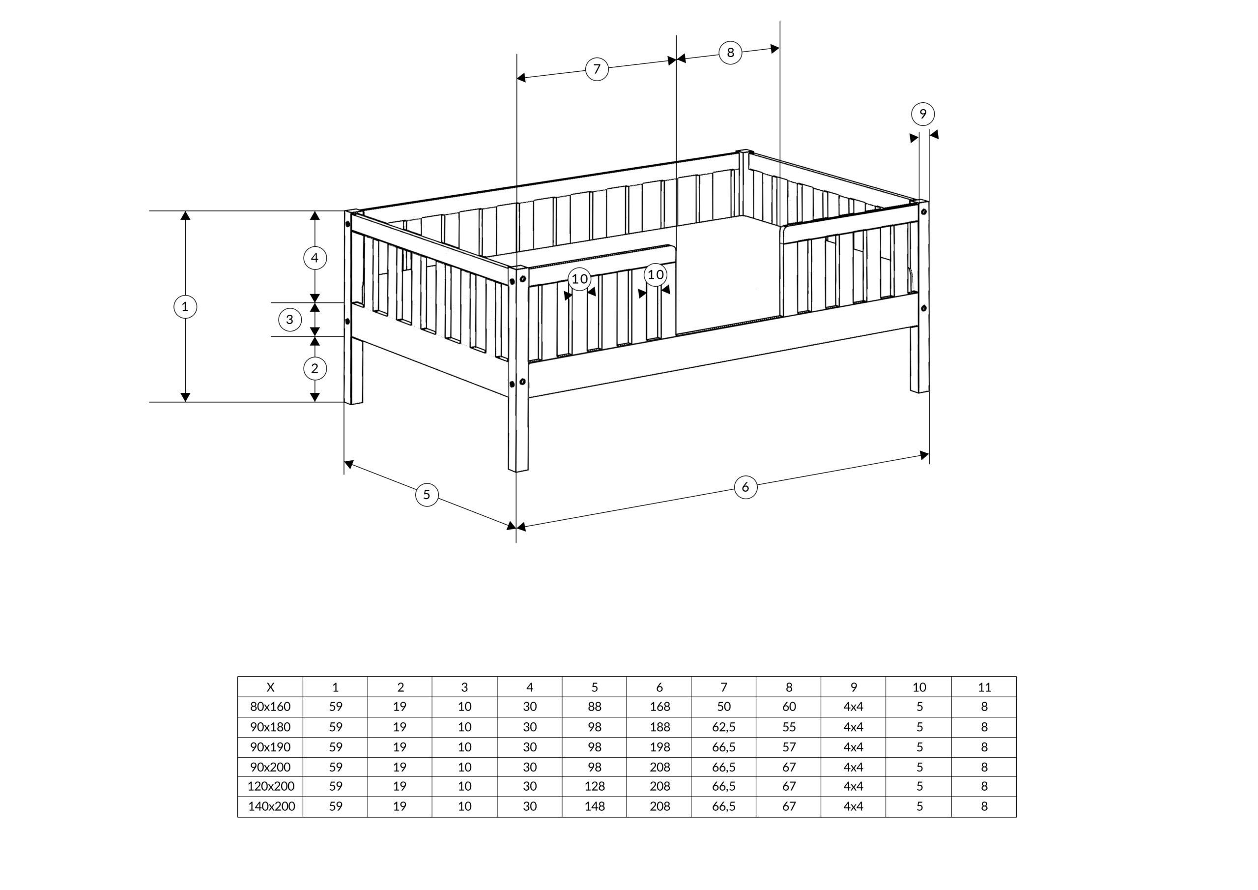 Łóżko dziecięce RYŚ CLASSIC zostało stworzone z myślą o najmłodszych. Łóżeczko zostało wykonane z wyselekcjonowanego drewna sosnowego I klasy. Wykonane jest w klasycznym designie co zapewnia komfort w użytkowaniu jak i tonuje wnętrze pokoju dziecięcego. Dzięki temu, że łóżeczko nie posiada daszku może być świetnie wykorzystane w pokojach dziecięcych na poddaszu gdzie jest ograniczona wysokość przez skosy poddasza. Łóżeczko dla dziecka RYŚ CLASSIC posiada szczebelki o szerokości 5 cm dość gęsto rozłożone po długości ramy łóżeczka co nadaje jej sztywności a zarazem pełnego i kompletnego designu. Poszczególne elementy drewnianej ramy łóżeczka są lekko zaoblone zwiększając bezpieczeństwo użytkowania przez najmłodszych. Nogi łóżka wykonane z drewna sosnowego o przekroju 4×4 cm pozwalają na swobodną zabawę dziecka na łóżeczku zachowując przy tym stabilność konstrukcji. W zestawie wraz z łóżeczkiem znajduje się stelaż pod materac również wykonany z listew sosnowych o grubości 2 cm i spiętych ze sobą taśmą co uniemożliwia przesuwani się szczebelków względem siebie dzięki czemu materac jest podparty równomiernie po całej długości.