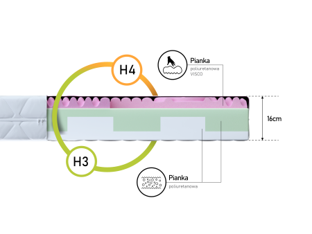Pianka o podwyższonej wytrzymałości i dobrej przepuszczalności powietrza, zapewnia świetną izolację termiczną. Nie odkształca się, dzięki czemu materac jest bardzo wygodny i gwarantuje komfort spania. Wysoka jakość pianki zapewnia bardzo dobre podparcie dla kręgosłupa. Dobrze amortyzuje ruch drugiej osoby, więc jest świetnym rozwiązaniem dla par, oraz dla dzieci, których układ kostny jest bardzo delikatny.